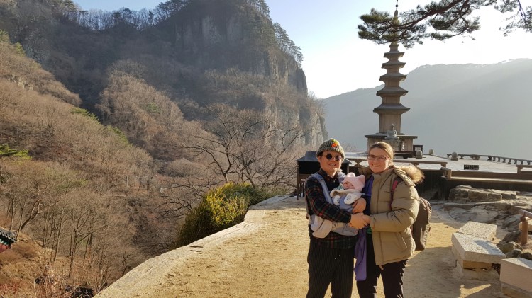Family road trip day 2: hiking at Cheongnyangsan 청량산. Whoo! Our first big hike with Jigu, and my first big one since just before she was born, six months ago today. It was glorious. Started out near a sparkling frozen waterfall. Golden winter light slanting through the trees, illuminating and enchanting the landscape. Nothing in nature is just ordinary. The smallest sprout or fluffy seed head is awe inspiring in moments like this. Cold fresh air in my lungs and baby sleeping warm and tight against my chest.
