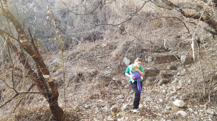 Steep uphill and of course stairs, when we come unexpectedly upon a tiny mountainside village (maybe four small homes, in all). No access road, but satellite dishes and fields for planting. Reminded me of Nepal, where homesteads and villages are found nestled deep in the mountains, miles and miles from any drivable roads. Though they showed signs of recent activity, no people were there when we passed through. We allowed this discovery to take us on a detour, taking the cross-mountain path past orchard with bare branches, a pot and pan dangling in the music of the wind to scare off the birds. The trail got sketchier as we went along; piles of loose stones under dry leaves, and a narrow path on the edge of a steep slope… No room for inattentive walking. Concentrating on each step, we eventually made it to a road up to the temple.