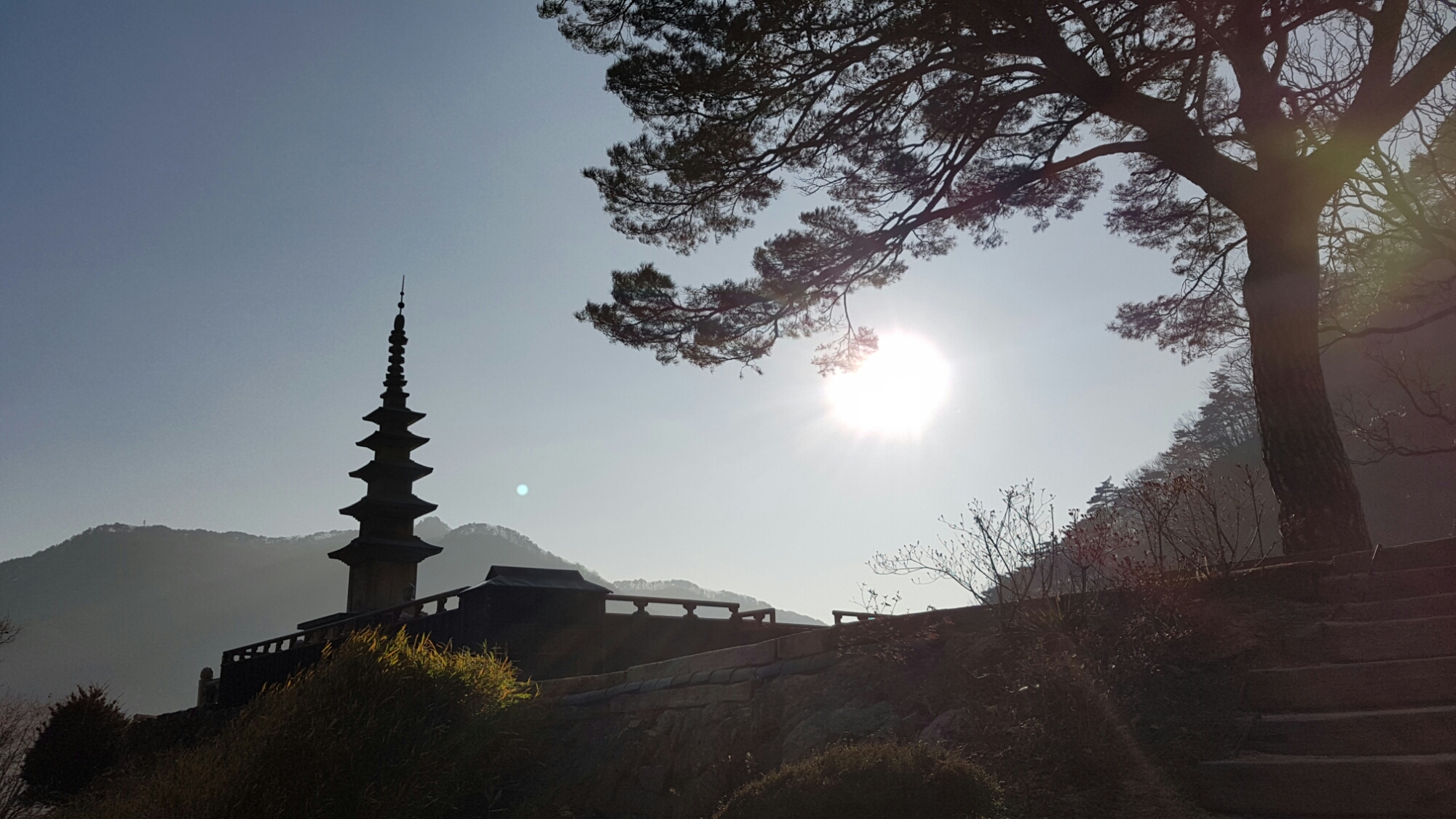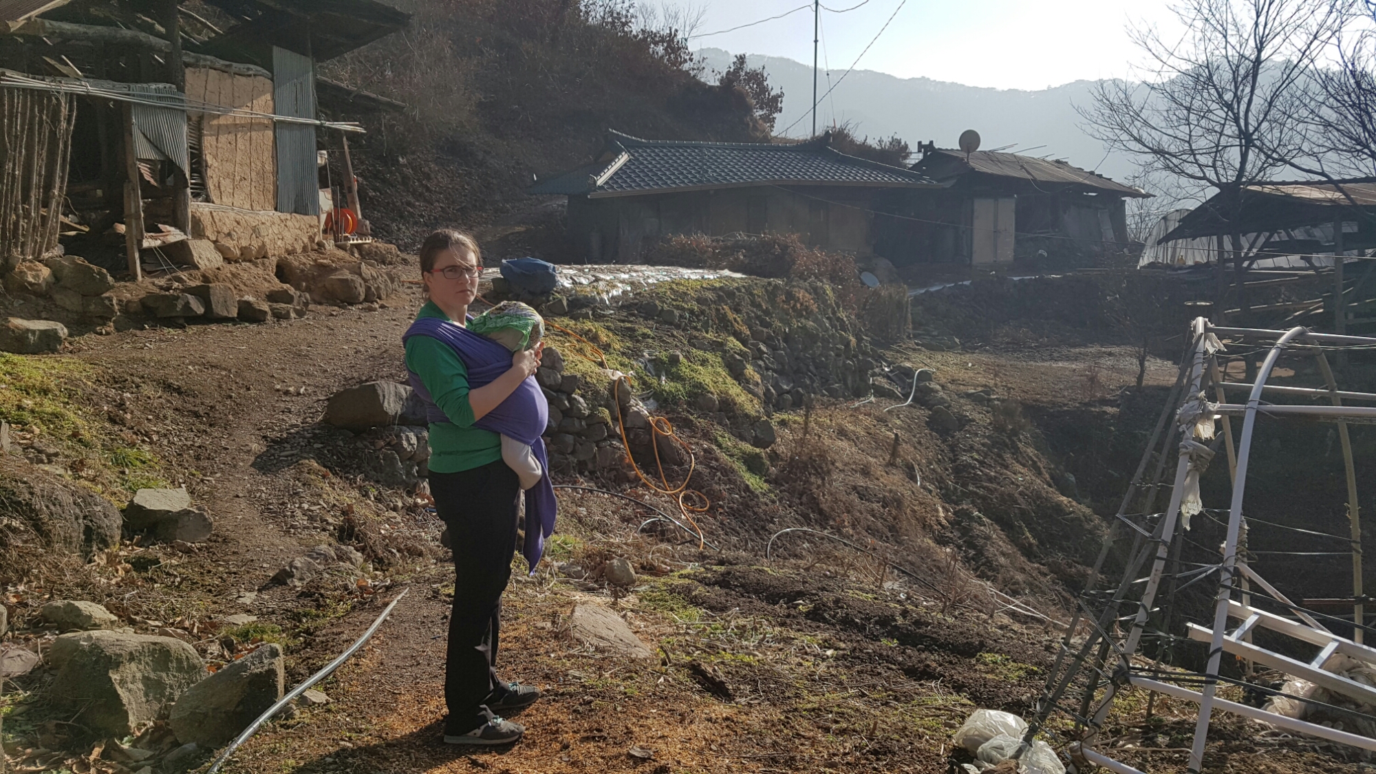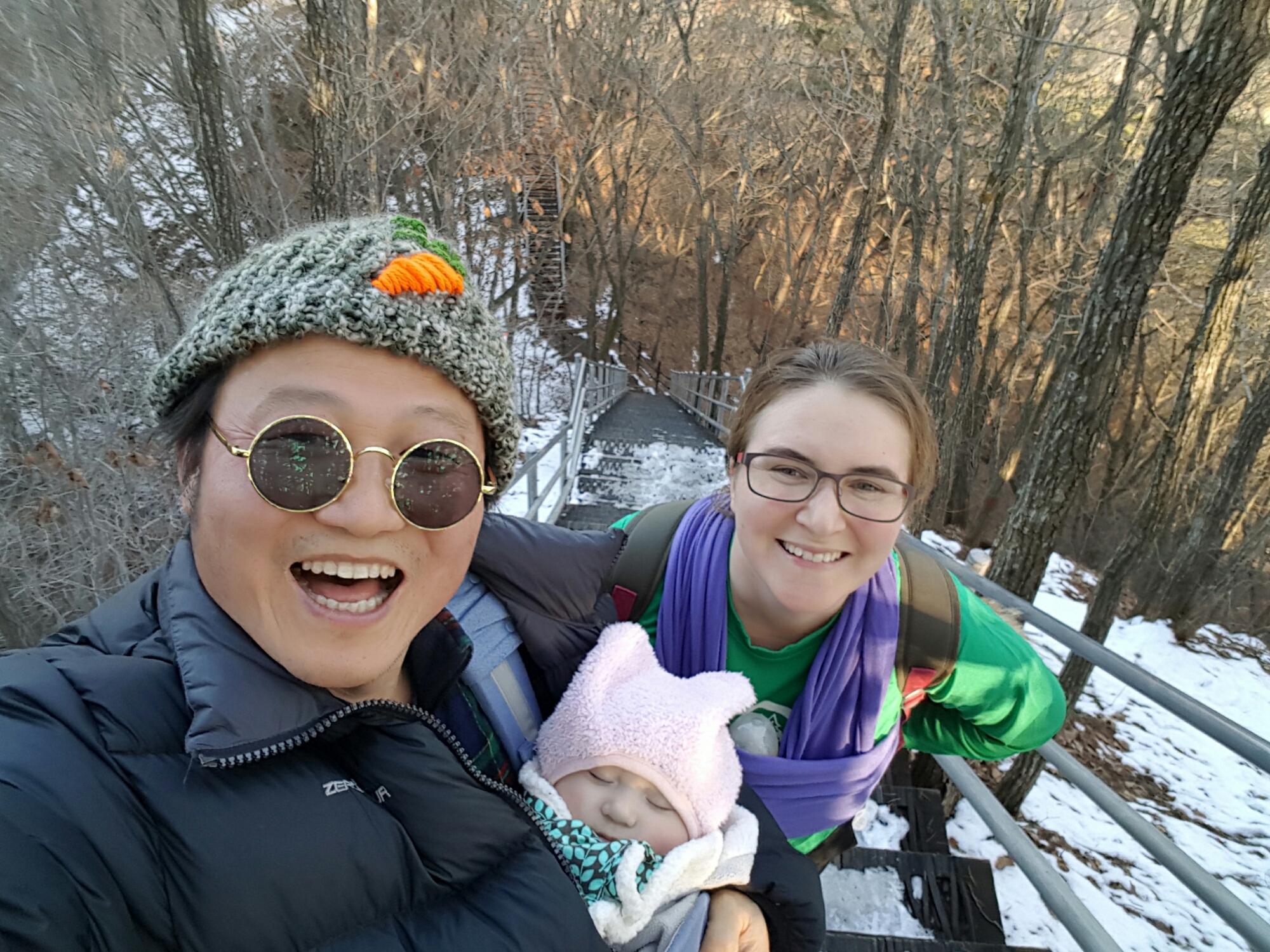 Family road trip day 2: hiking at Cheongnyangsan 청량산. Whoo! Our first big hike with Jigu, and my first big one since just before she was born, six months ago today. It was glorious. Started out near a sparkling frozen waterfall. Golden winter light slanting through the trees, illuminating and enchanting the landscape. Nothing in nature is just ordinary. The smallest sprout or fluffy seed head is awe inspiring in moments like this. Cold fresh air in my lungs and baby sleeping warm and tight against my chest.